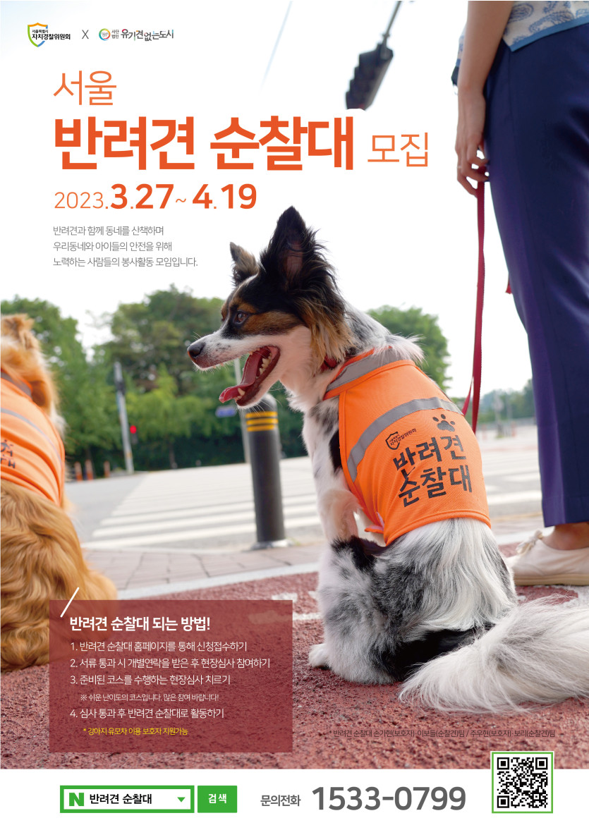 [2023년 서울 반려견 순찰대 모집] "우리는 동네를 지키는 반려견 순찰대!" 반려견과 산책하며 우리동네 안전을 지키는 서울 반려견 순찰대를 모집합니다. 서울 반려인 여러분들의 많은 지원 부탁드립니다! ▶접수안내◀ 1. 모집대상 : 서울거주 보호자+반려견 2. 접수기간 : 3월 27일 ~ 4월 19일(17시마감) ▶선발심사◀ ★현장 심사를 통해 선발합니다 ★심사일시와 장소는 홈페이지 접수시 선택가능 1. 선발기간 : 4월 22일, 4월23일 중 택1 2. 선발장소 : 마포구민체육센터 / 뚝섬한강공원 / 송파반려견놀이터 / 중 선택 가능 3. 결과발표 : 4월 25일 17시 전(개별통보) ☎문의 1533-0799 Insta @lets_go_petrol 서울반려견순찰대는 [서울자치경찰위원회]가 함께합니다. |